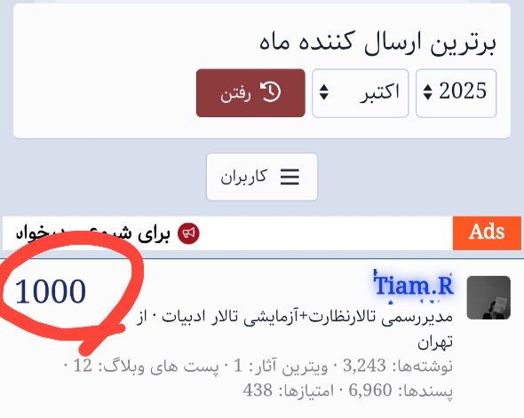 FarzaneFarzane عضو تأیید شده است. مدیر اجرایی انجمن پرسنل مدیریت مدیر اجرایی انجمن مدیر ارشد فرشته زمینی مسئولیت پذیر پشتکار خوب خانم نمونه مدیر اجرایی انجمن مدیر ارشد مدیر رسمی حمایت رتبه اول مسابقات نوشتهها نوشتهها 1,780 پسندها پسندها 5,705 امتیازها امتیازها 438 سکه 3,759 دیروز ساعت 09:03 #336 @Tiam.R ۸ اکتبر، اول ماه، ۱۰۰۰ ارسالی خدا قوت